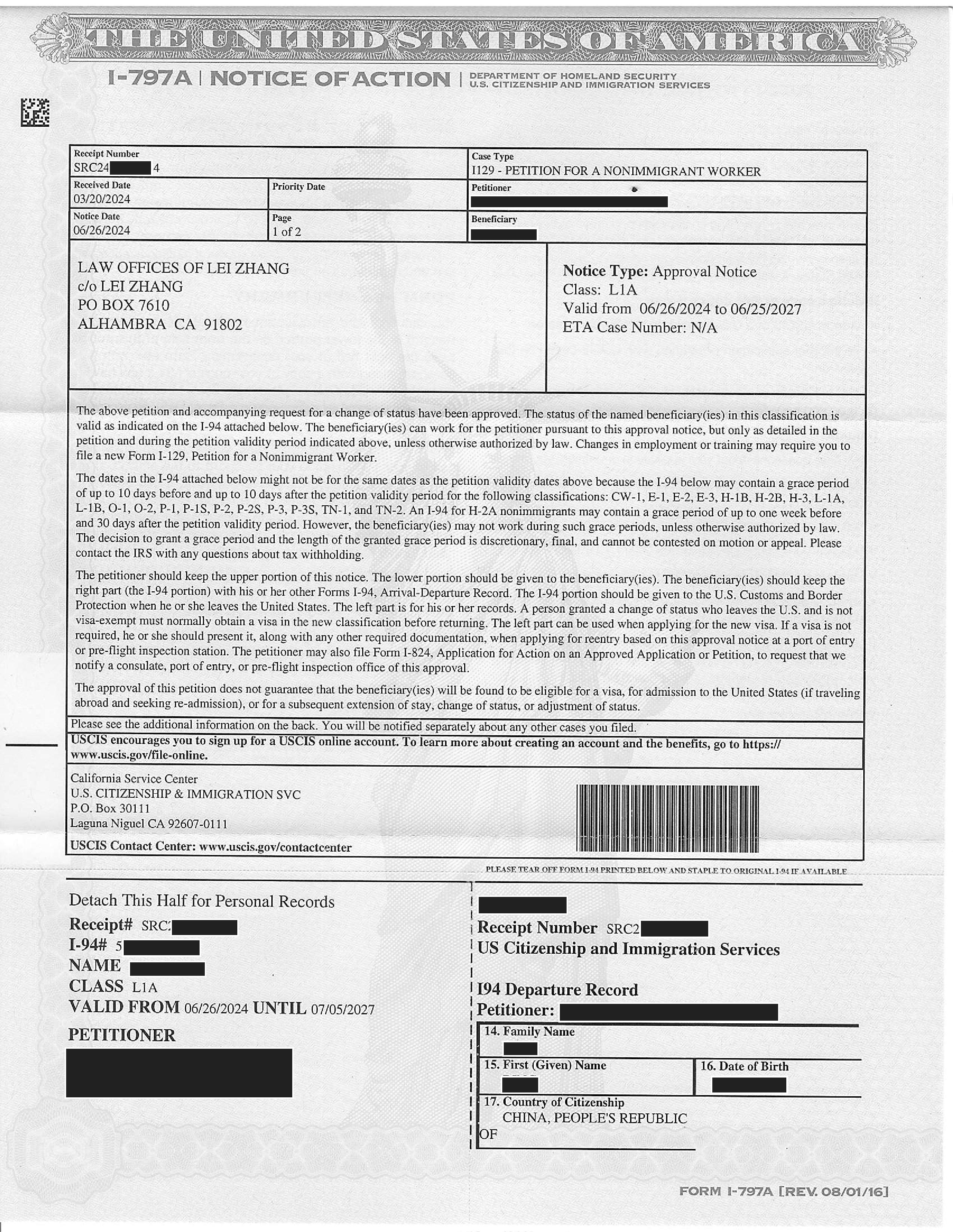 加州物流公司劳工移民I-140申请获准(05/29/2024)