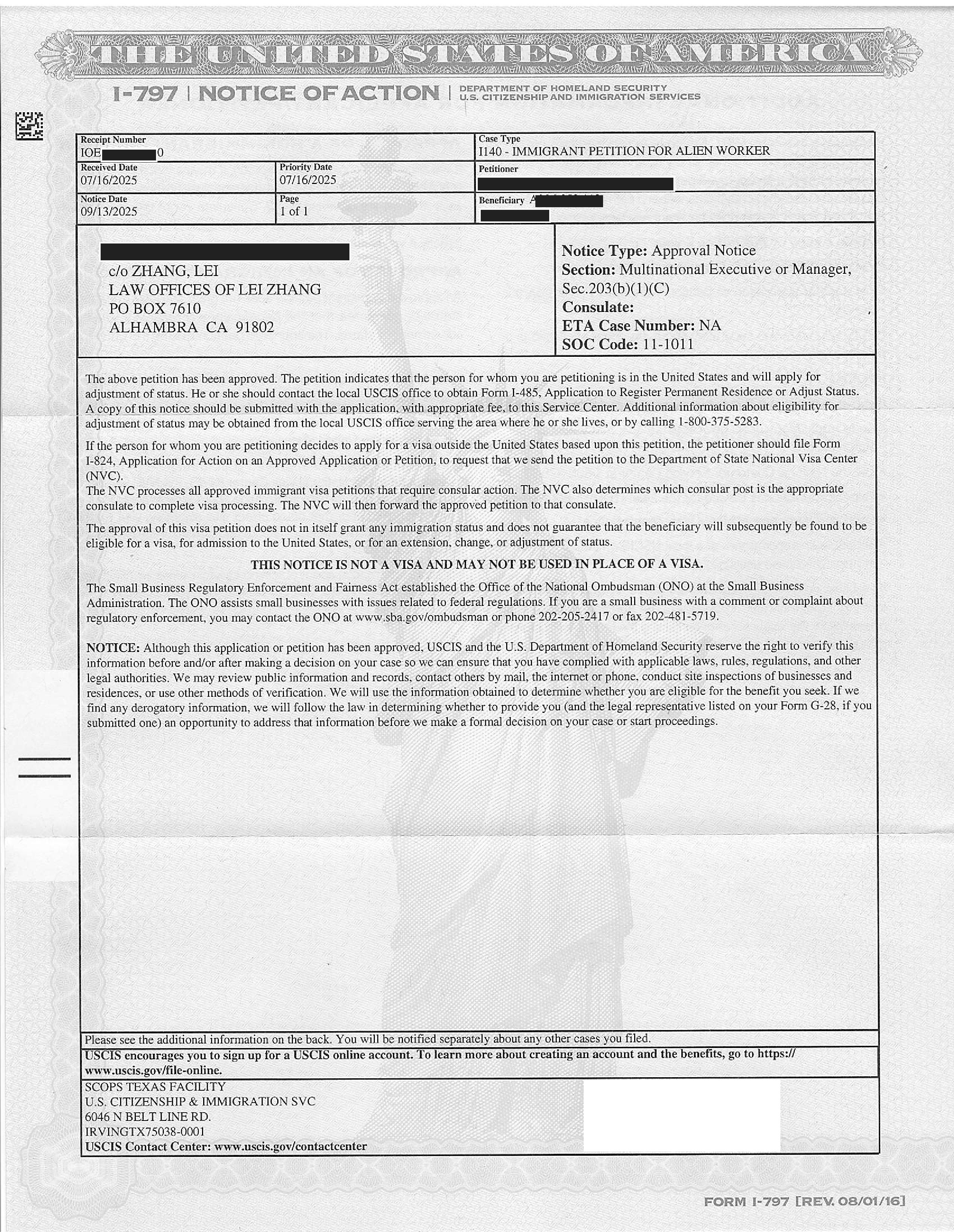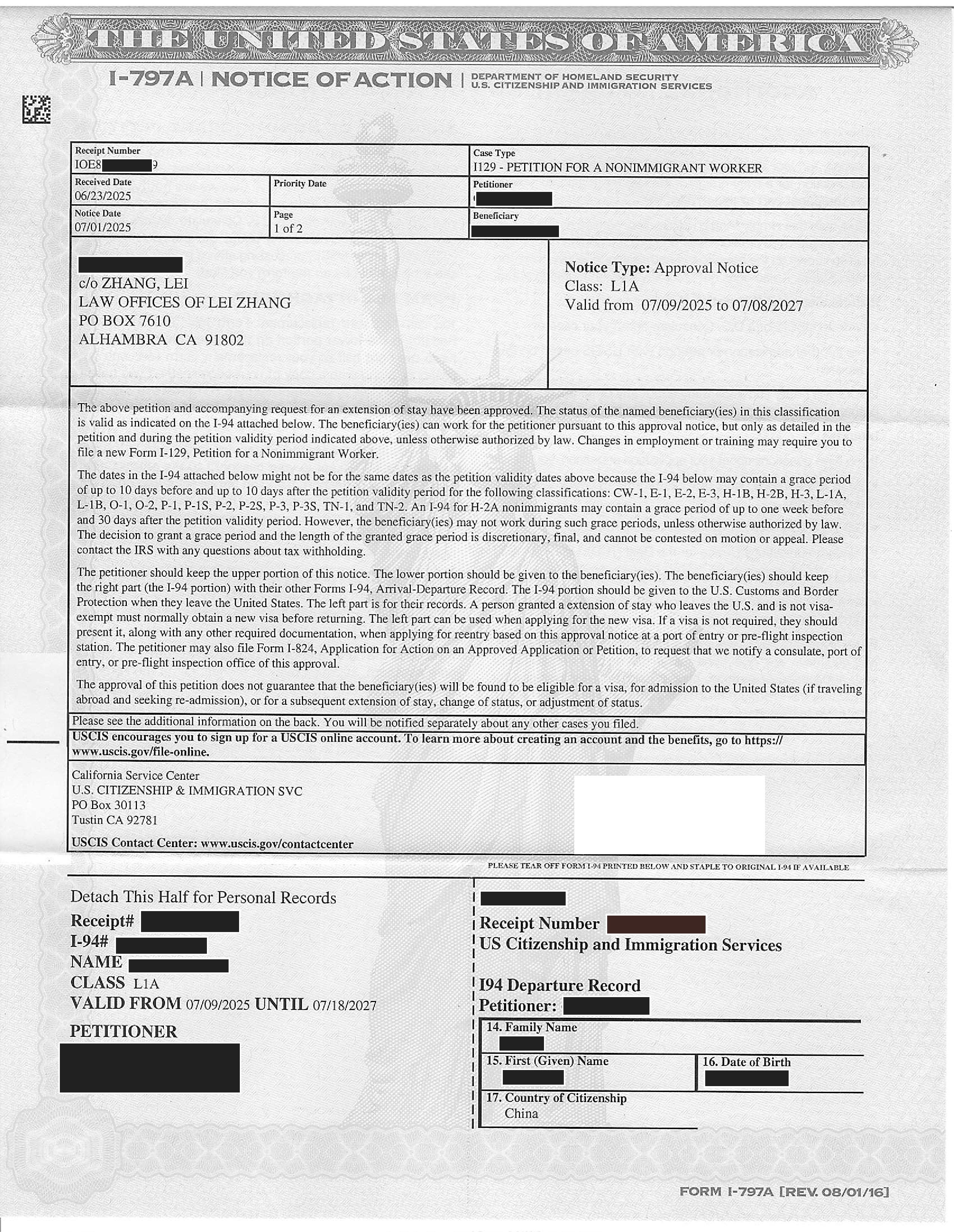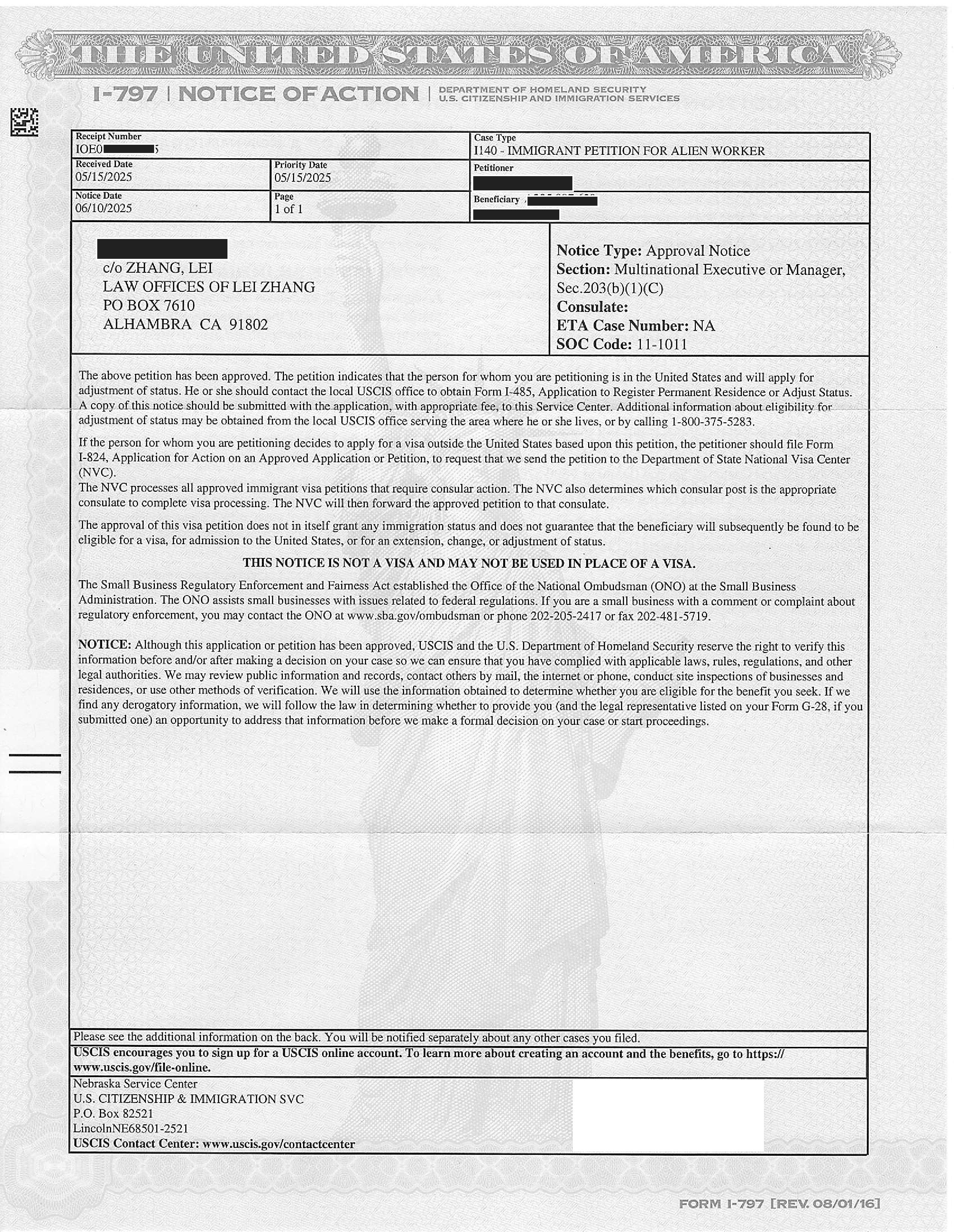 加州高科技跨国公司经理绿卡I-140申请获准(03/13/2025)