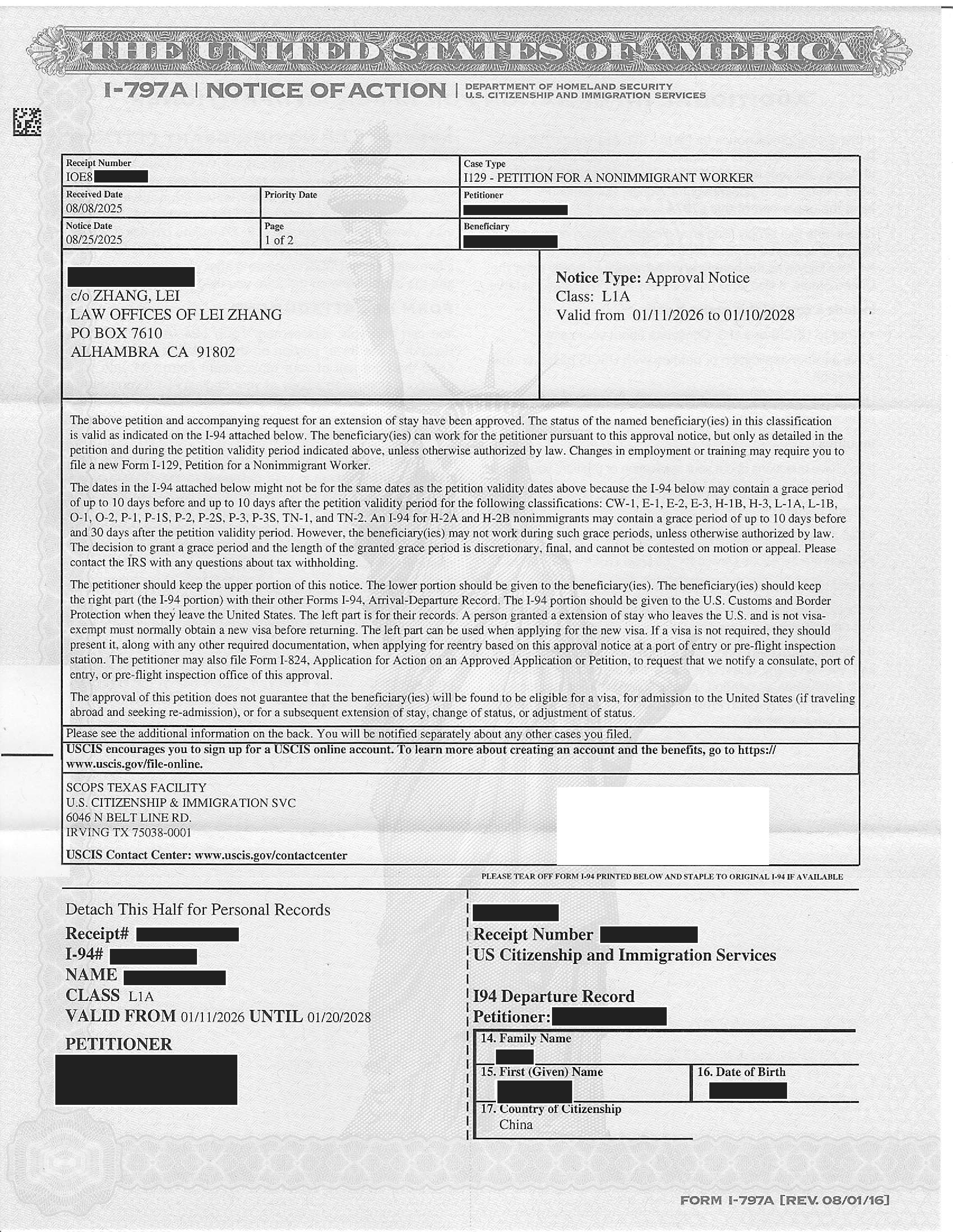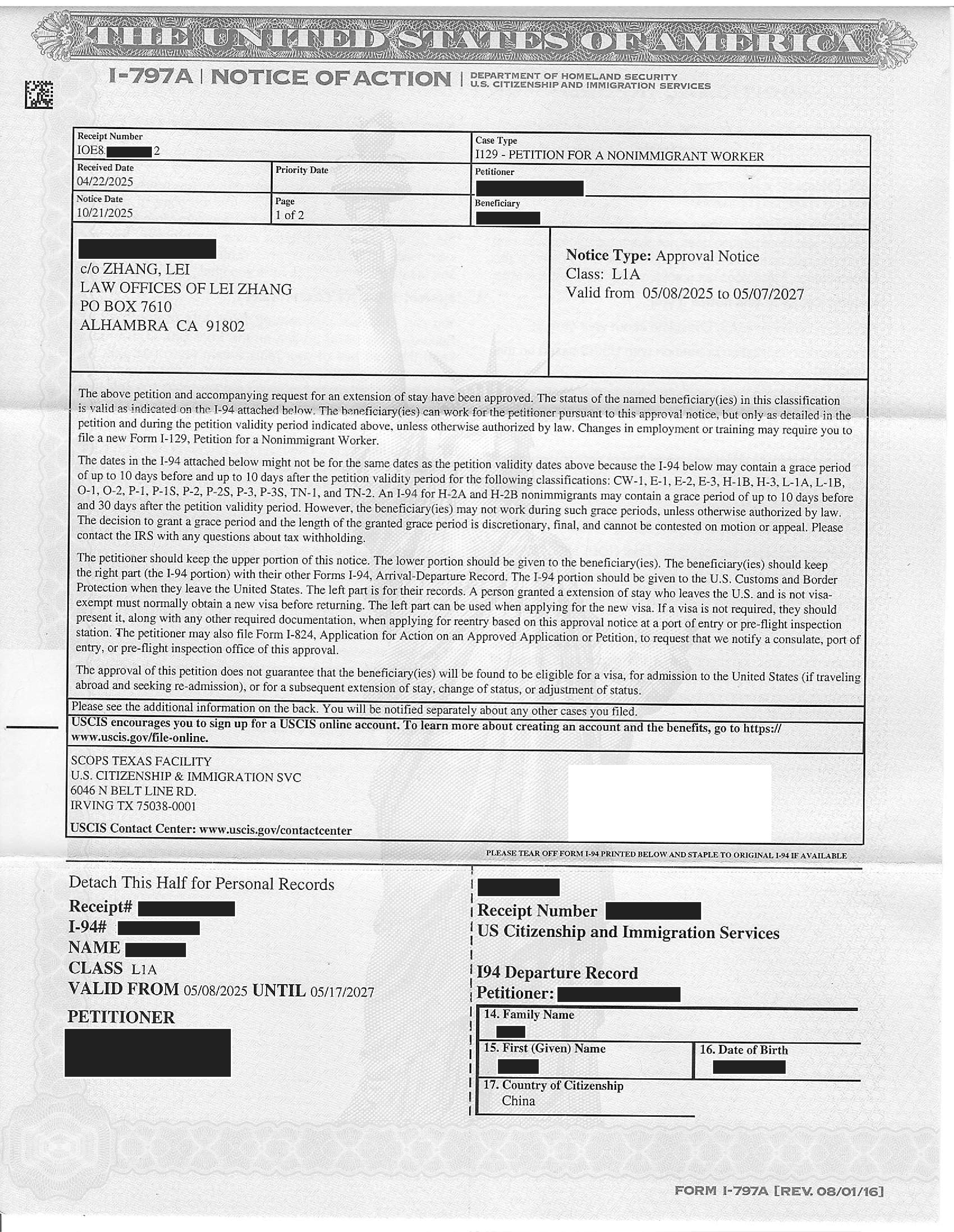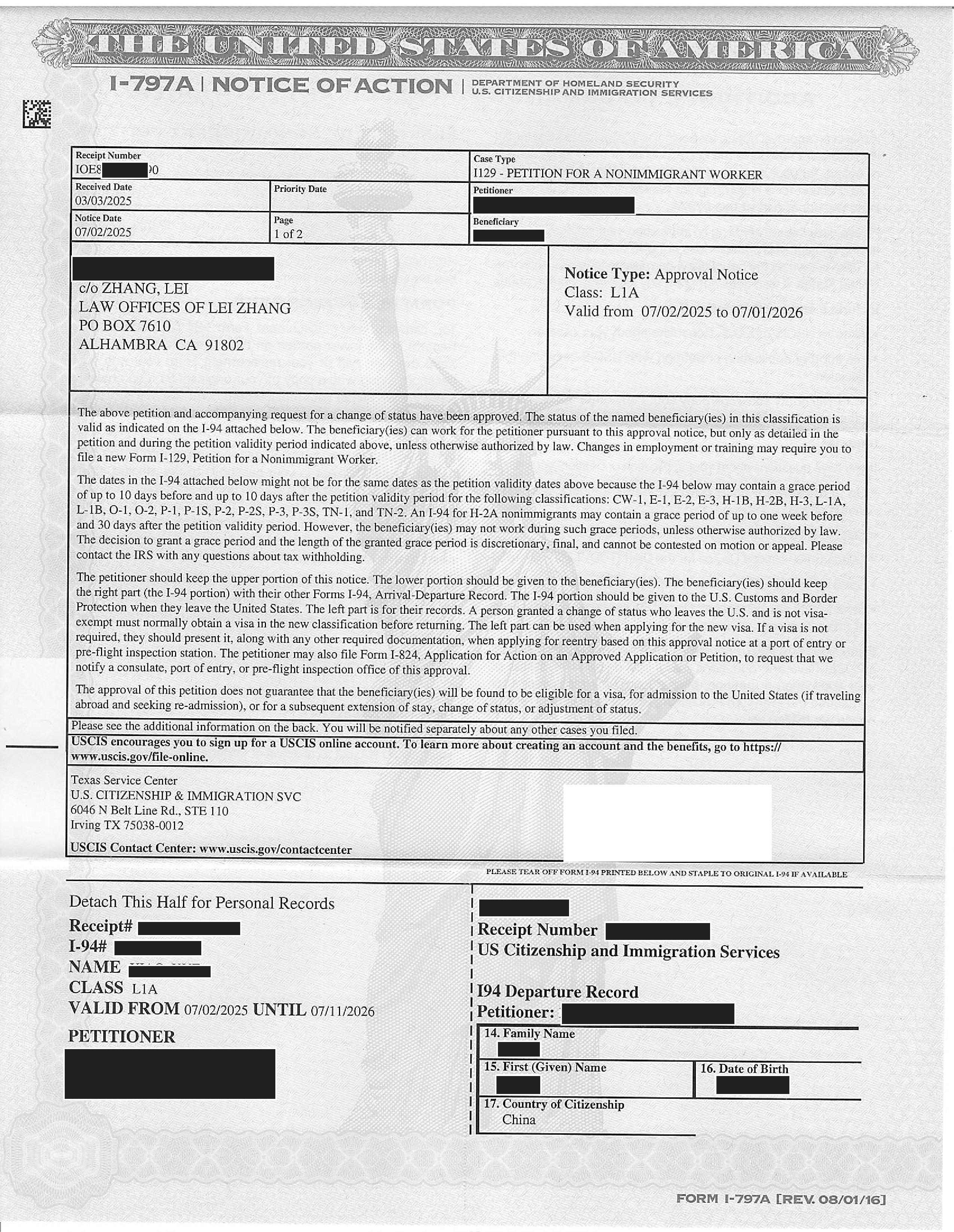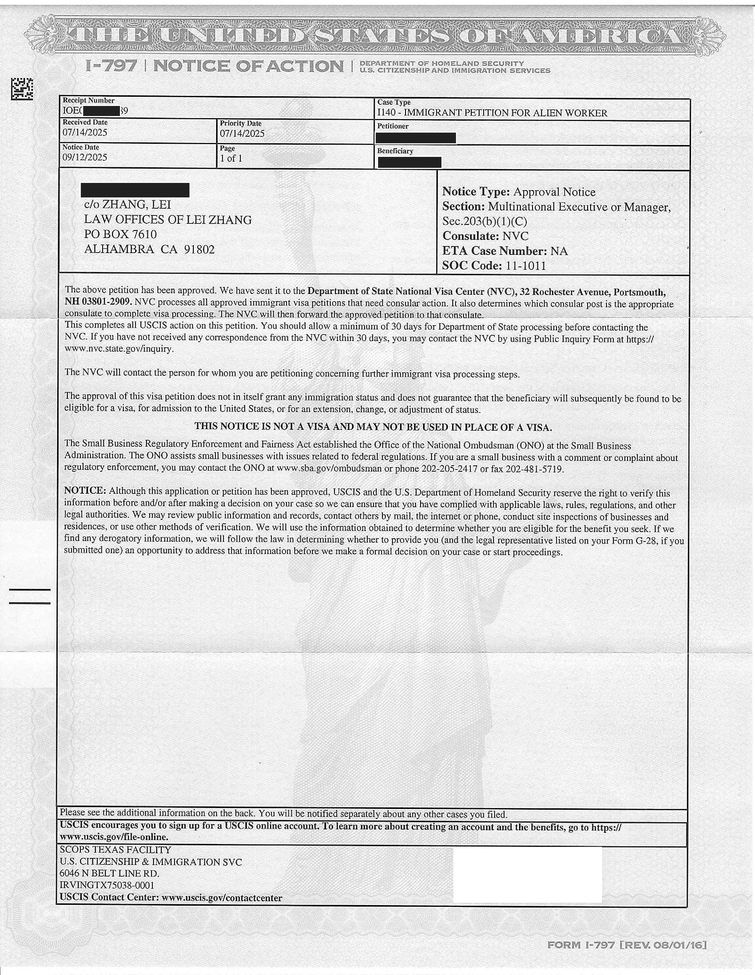 加州高科技跨国公司经理绿卡I-140申请获准(03/13/2025)
