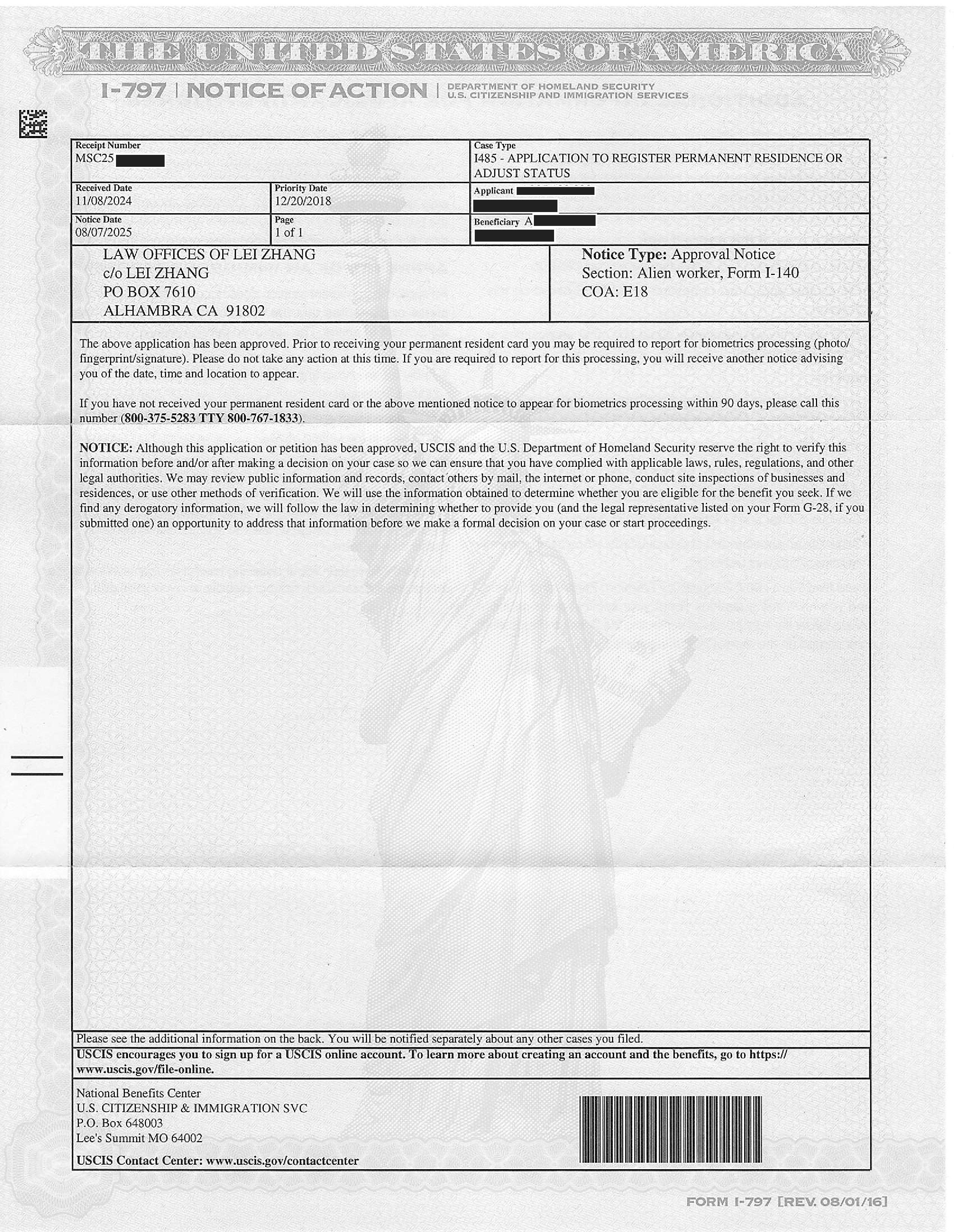 电器跨国公司经理绿卡I-485申请获准(08/07/2025)