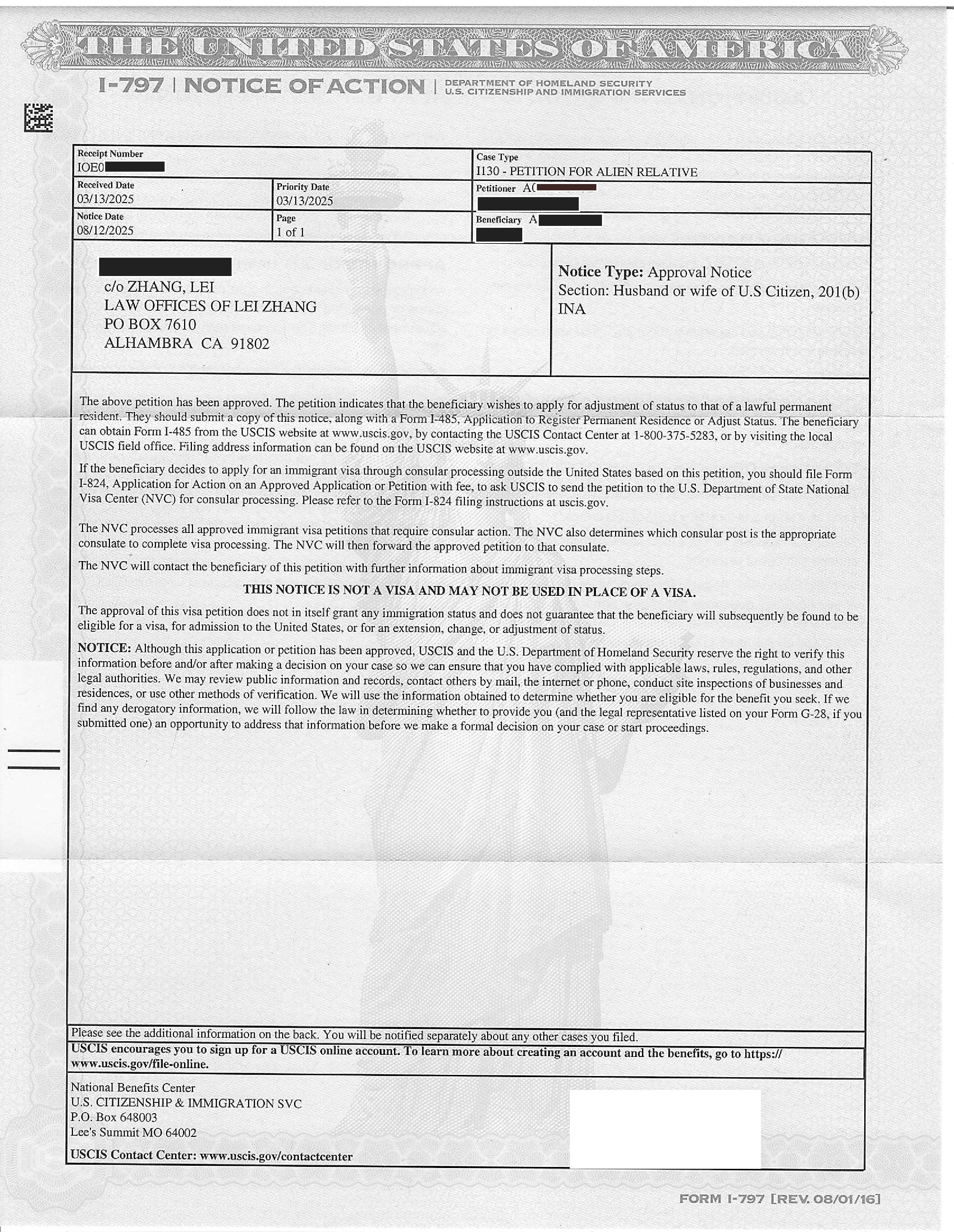 亲属移民I-130申请5个月获准(08/12/2025)