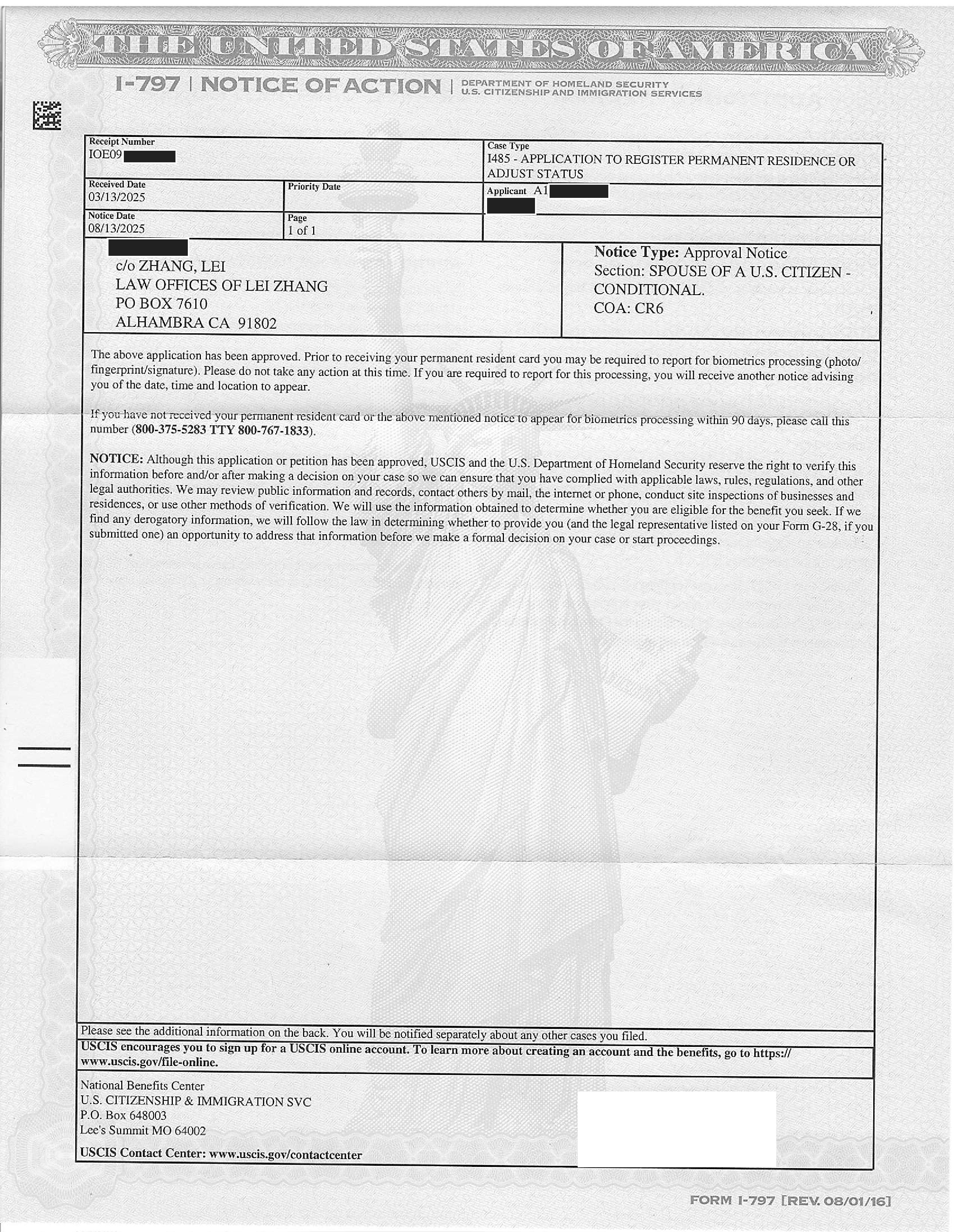 亲属移民I-485申请5个月获准(08/13/2025)