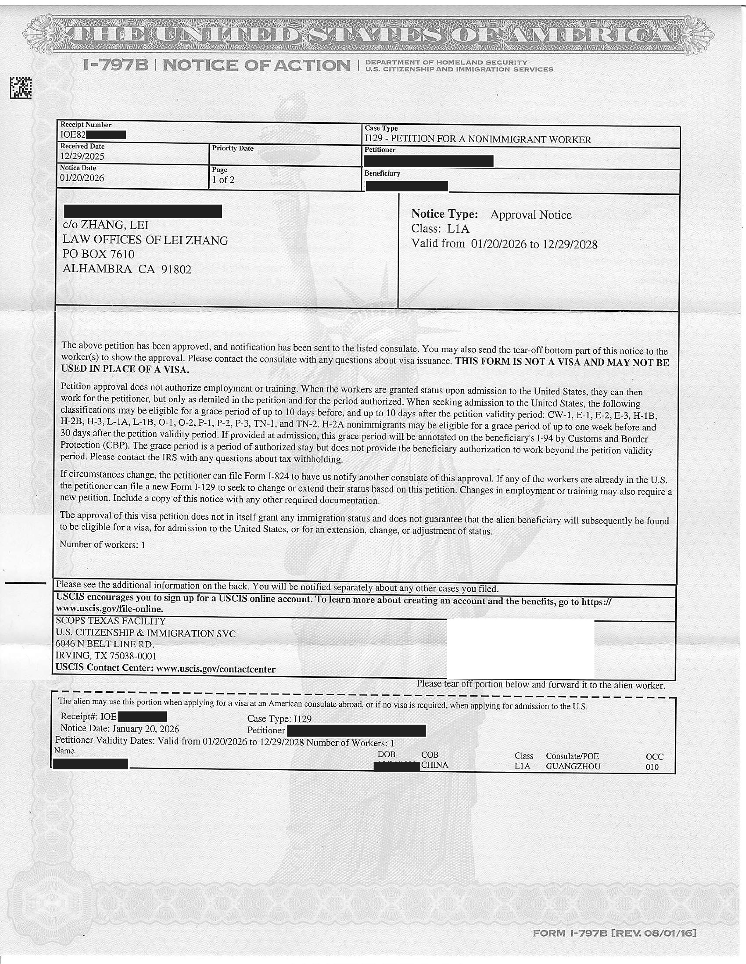 加州物流公司第5位L-1申请15个工作日获准(01/20/2026)