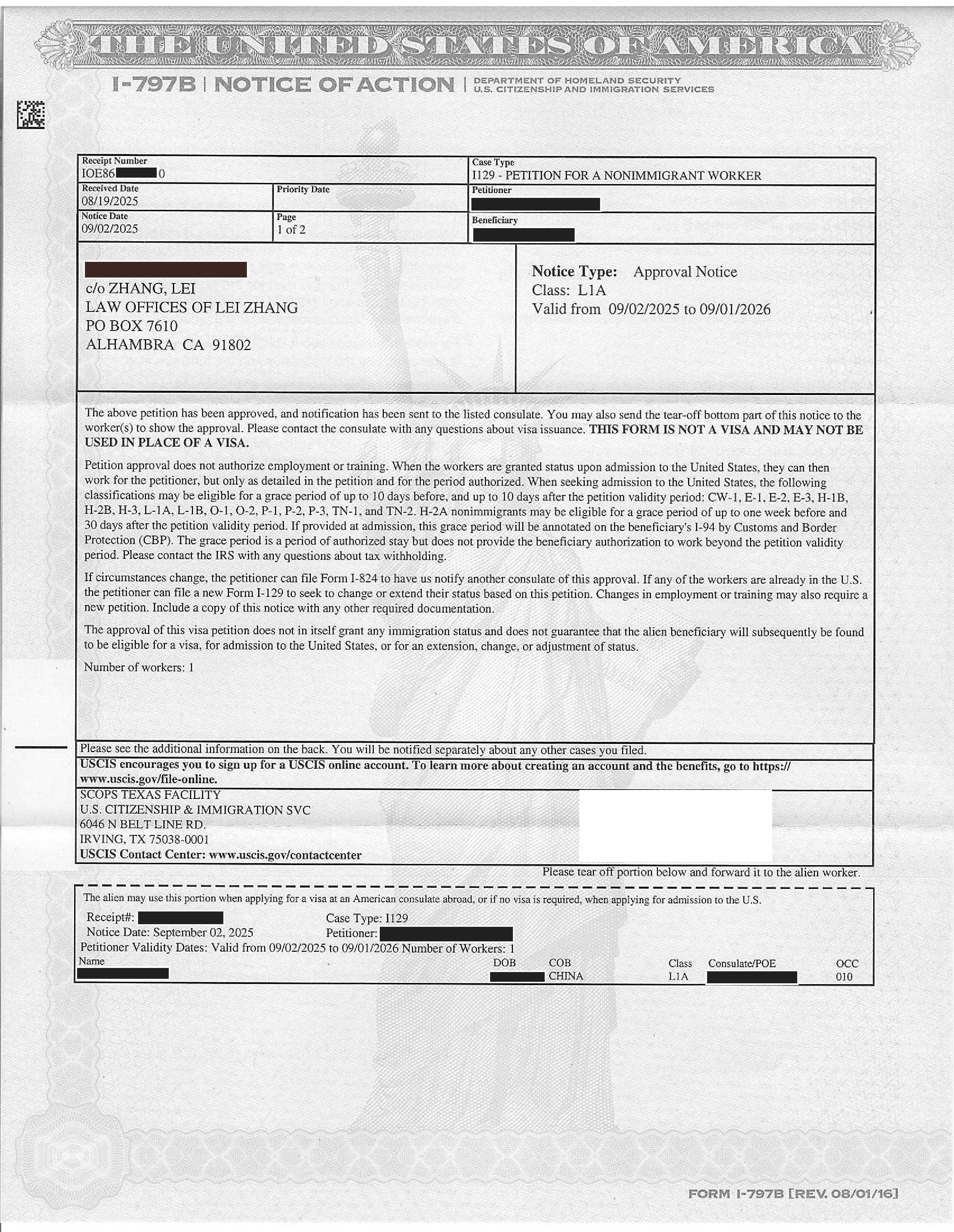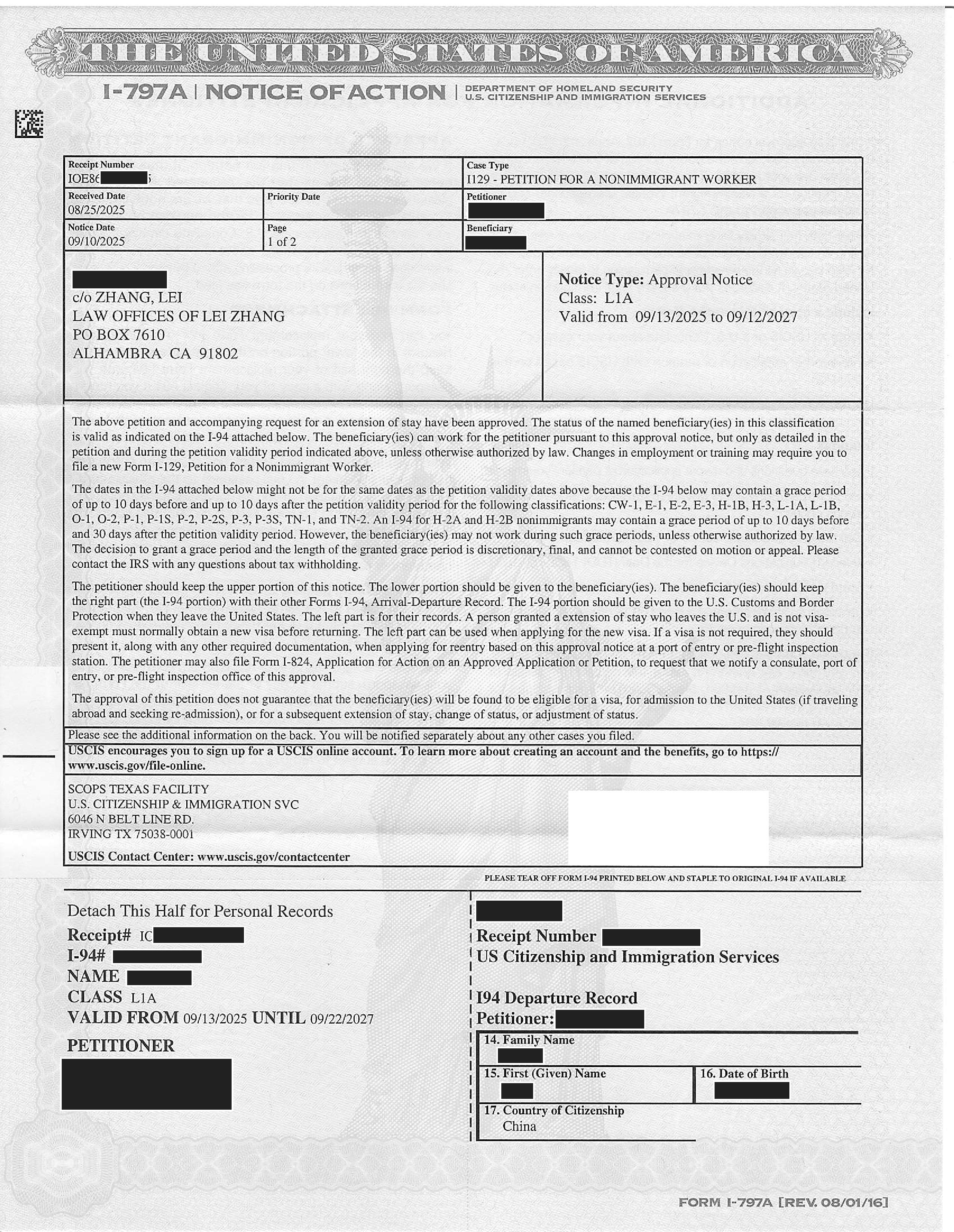加州物流公司L-1延期申请11个工作日获准(09/10/2025)